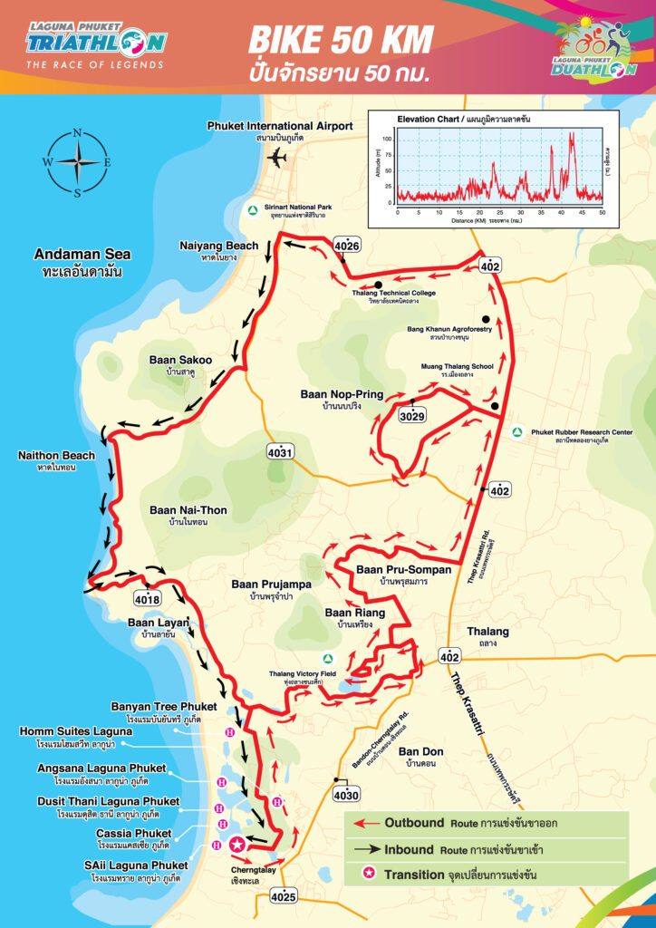 Each route blends scenic and challenging elements — from the swim across the Andaman Sea and lagoon, to the bike up the picturesque Naithon Hill, and the run through the tropical resort grounds toward a beachside finish line.